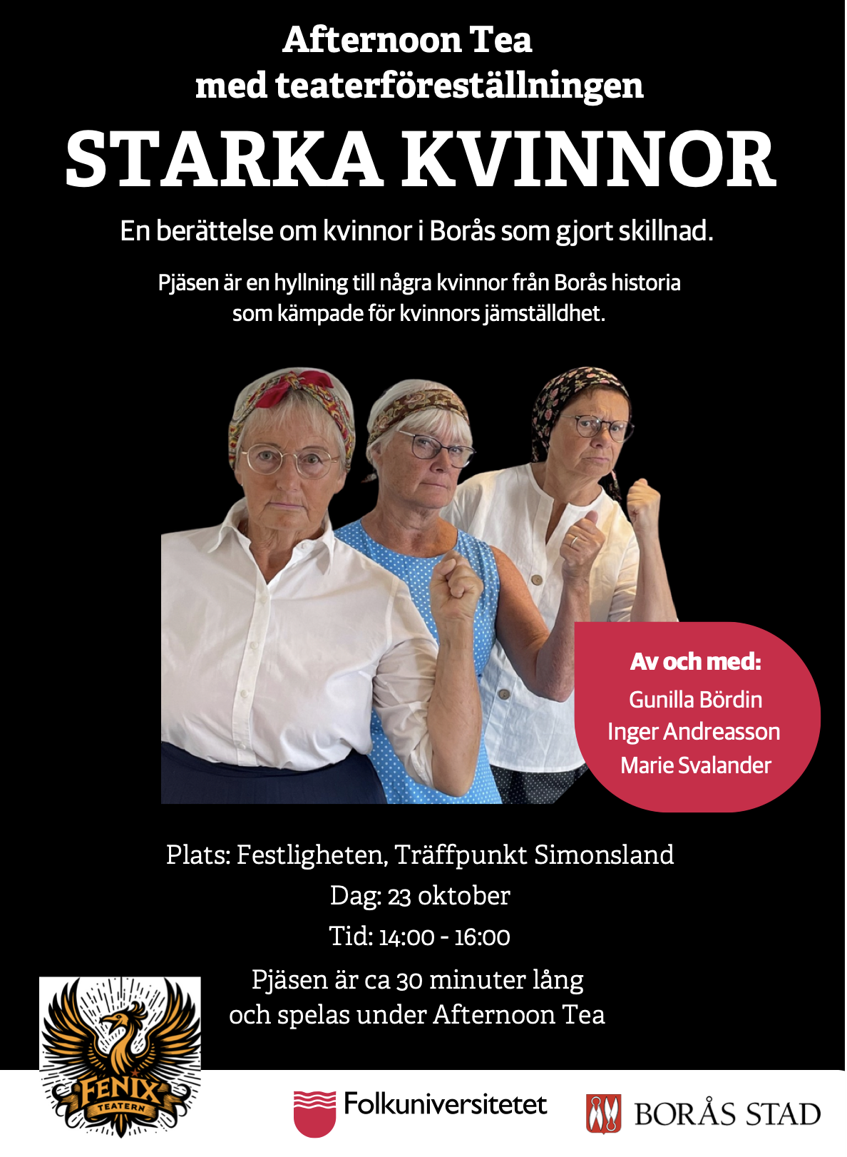 Pjäsen "Starka Kvinnor" är en gripande berättelse av Inger Andreasson, Gunilla Bördin och Marie Svalander som fokuserar på betydelsefulla kvinnor från Boråstrakten. Med en speltid på cirka 30 minuter belyser den deras liv och avtryck i samhället.